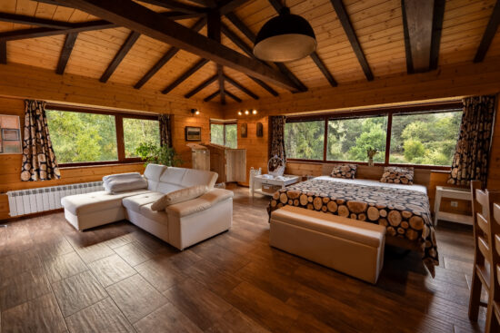 Пространството включва комфортно спално помещение със зона за релакс и камина, създаваща уютна атмосфера през всички сезони.